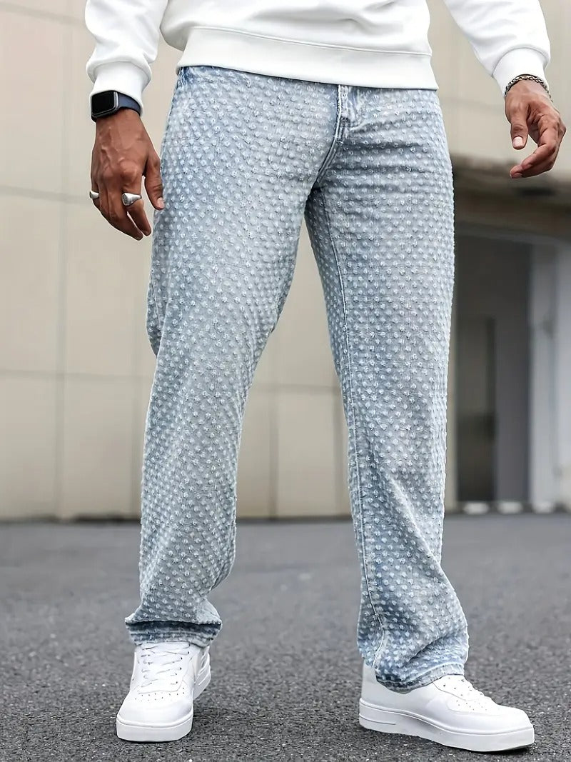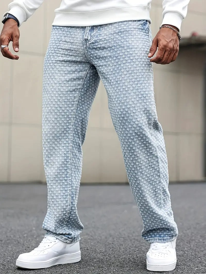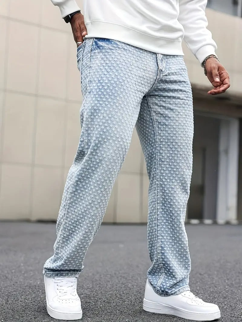 Deze heren denim spijkerbroek heeft een wassing en een textuur die het grootste deel van het oppervlak bedekt. Het patroon bestaat uit verhoogde bultjes verspreid over het oppervlak. Ze hebben twee zakken aan de voorkant en twee zakken aan de achterkant voor opbergruimte.