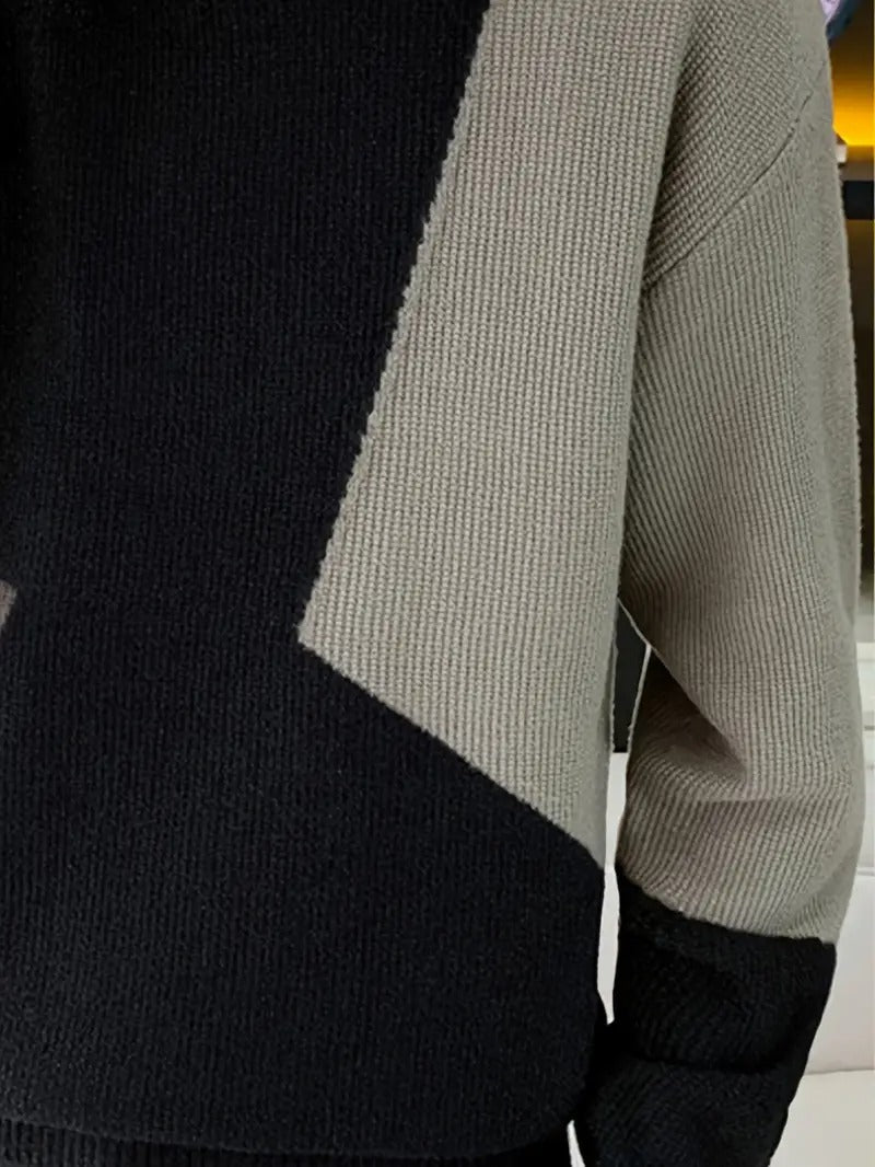 Deze herentrui heeft geometrische vlakken geplaatst over het lichaam en lopen asymmetrisch door op de mouwen. Het patroon creëert een patchwork-indeling die zich uitstrekt over verschillende delen van het kledingstuk.